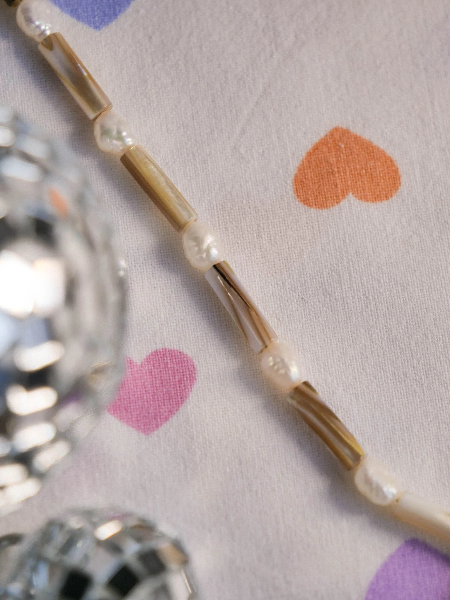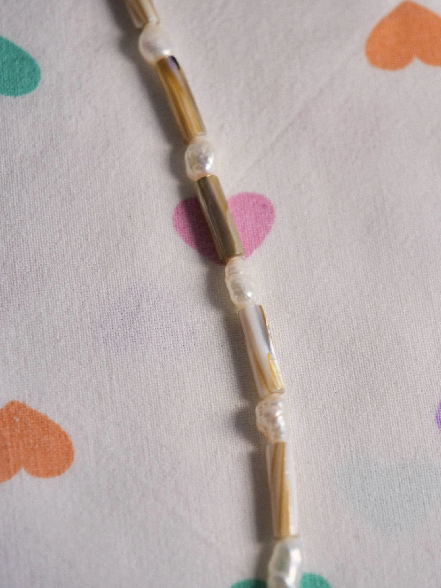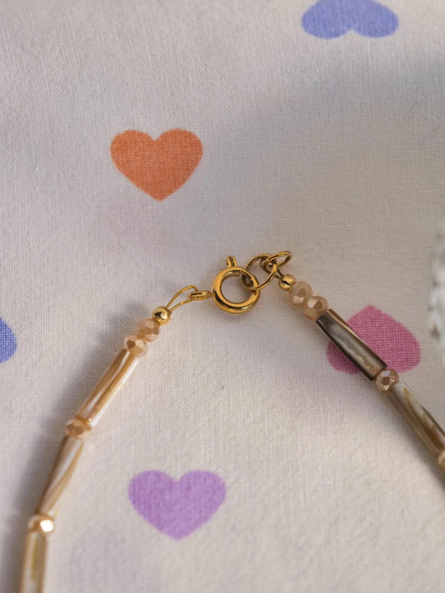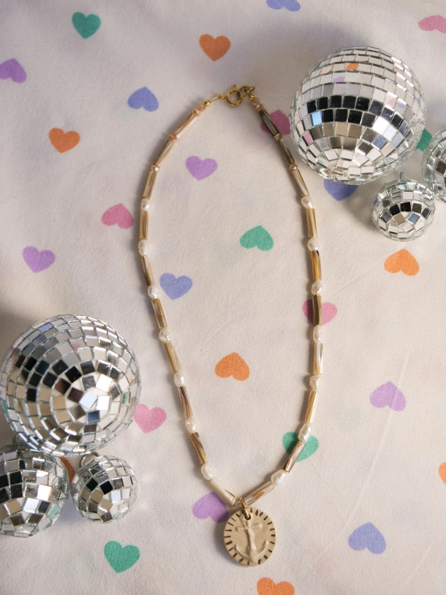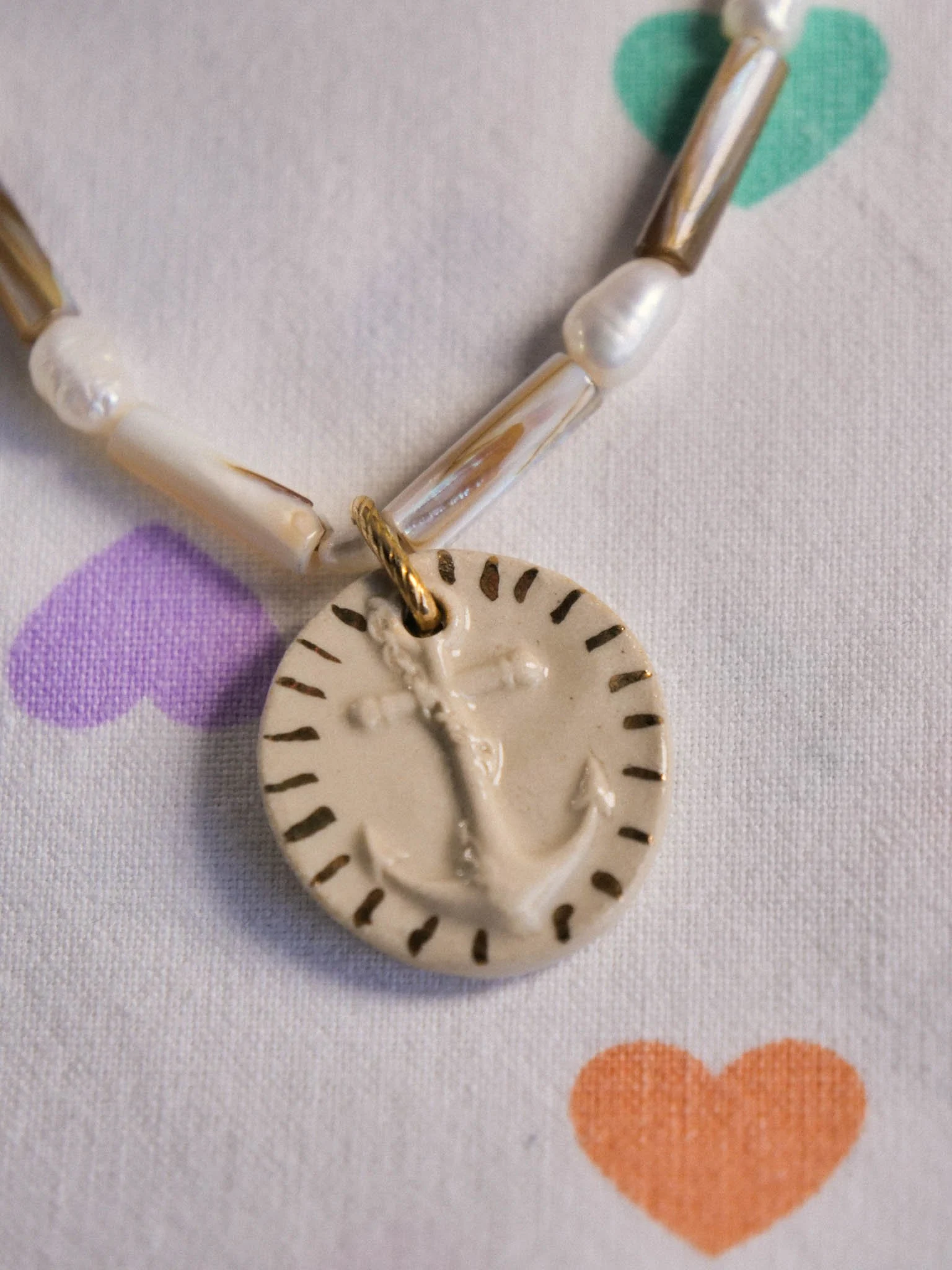 Médaillon en céramique doré. Collier fait en perles d’eau douces et coquillages.